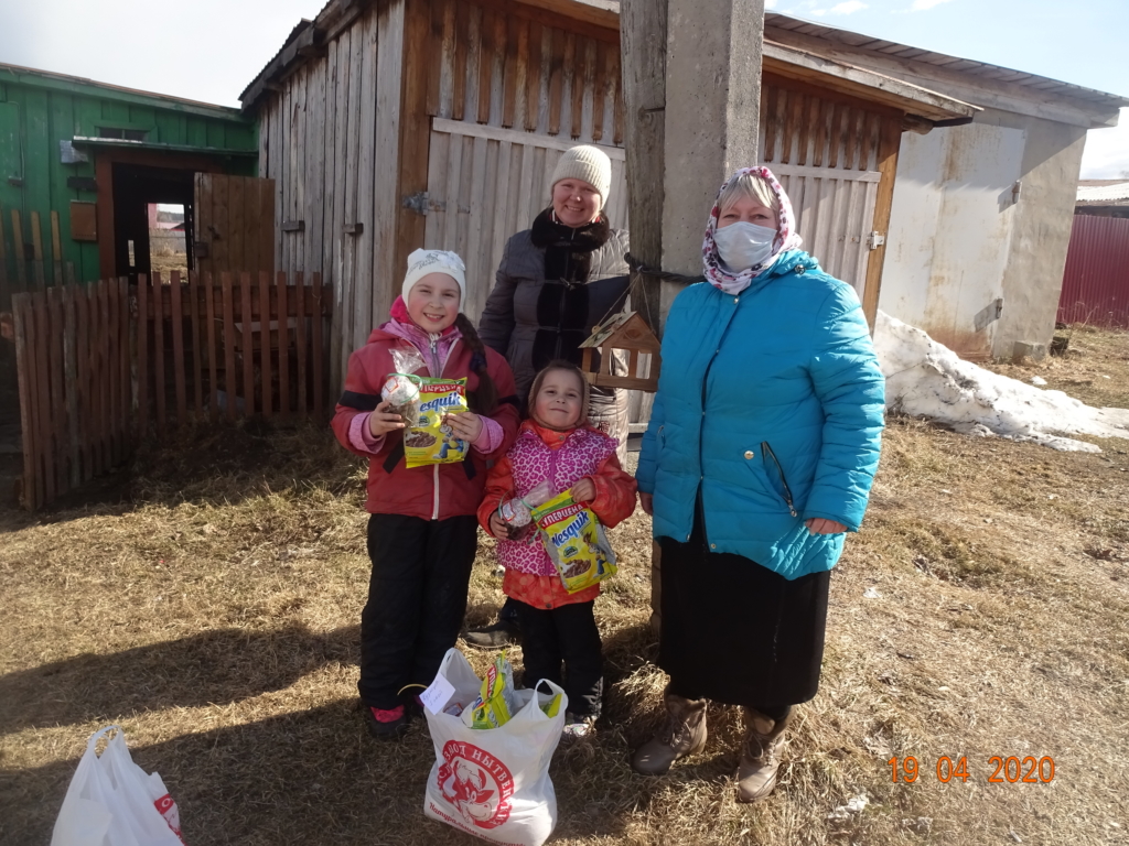 На Пасхальной седмице волонтеры семейного клуба «Лучики Добра» при храме Похвалы Пресвятой Богородицы п. Орел Кибанова Лидия Георгиевна и Кузнецов Андрей Владимирович посетили нуждающиеся семьи п. Орел, поздравили их с праздником и вручили пасхальные гостинцы и продуктовые наборы.